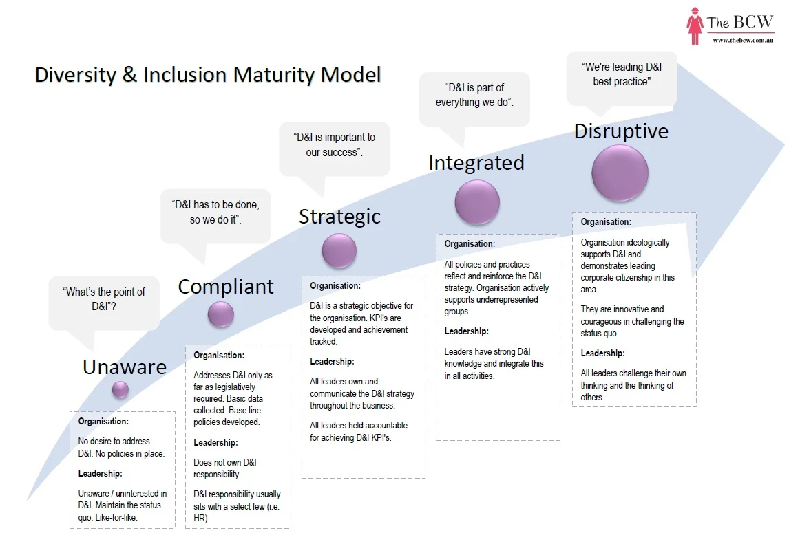 However, we recognise that every Organisation's approach to Diversity and Inclusion is unique and must take into account the history and culture of the business. The BCW therefore offers services to support organisations at all stages of Diversity & Inclusion Maturity.